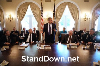 breaking the sound barrier. 9:23 a.m.: Bush talks privately with Cheney, his National Security Adviser Condoleezza Rice, the head of the FBI, Robert Mueller and Governor George Pataki of New York. Why does Bush wait from 9:05 (when Card tells him of United Airlines Flight 175 hitting the WTC) till 9:23 to finally call? He still does not give the authority to the fighters to shoot down any hostile airliners (fighters do not need his OK to intercept that should have of course happen automatically [but didnt -- or it was IGNORAD] his orders are only needed to shoot down a commercial airliner). What is he waiting for? 9:24 a.m.: The FAA notifies NORAD that American Airlines Flight 77 has been hijacked. The FAA lost contact with American Airlines Flight 77 when the transponder signal stops at 8:56 a.m. -- Why does it take 33 minutes for the FAA to tell NORAD that American Airlines Flight 77 has been hijacked? Impossible. Stand Down. 9:24 a.m.: NORAD orders the 1st Fighter Wing from Langley Air Force Base in Hampton, Virginia to scramble two, possibly three F-16 fighters. This time NORAD does not sit on this vital information for six minutes (or more) before notifying Langley AFB (like they did before they scrambled Otis). Langley is 130 miles south of Washington D.C. and the Pentagon. The F-16 has a top speed of 1500 MPH. Why wasnt Langley AFB scrambled at 8:20 or 8:40 or 8:46:26 or at the very least at 9:02:54? How could NORAD possibly have waited the 21 minutes from the time United Airlines Flight 175 hits the South Tower of the WTC at 9:02:54 before finally scrambling Langley at 9:24? Waiting these 21 extra minutes to finally scramble Langley is the real smoking gun Stand Down that no one can get around. Inconceivably, Andrews Air Force Base, with its two fighters wings only about 11 miles from the Pentagon never got off the ground, till after everything was over. They must have been told to Stand Down. This Stand Down that happened at Andrews AFB is the same thing that happened with the at least 35 Air Stations that were easily within distance to protect us of all of these hijackings. They were all told to Stand Down. The following link lists the